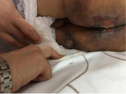 首先由责任护士池晓辉介绍患者情况,护士长罗坤金作补充,伤口造口小组成员在床边查看患者后,针对伤口情况进行评估:一例患者,女性,92岁,营养尚可,二便无法自理,双侧臀部及大腿根部皮肤发红,为失禁性皮炎,右肋下见散在水疱破溃,约5×6cm2;另一例患者,男性,75岁,院外带来全身多处压疮,骶尾部、肛周III度压疮,伴中量黄色脓性渗出物,左右膝关节内侧、左外踝见II度压疮伴少许黄色脓性渗出物,最近一次生化报告示白蛋白30.2g/L。