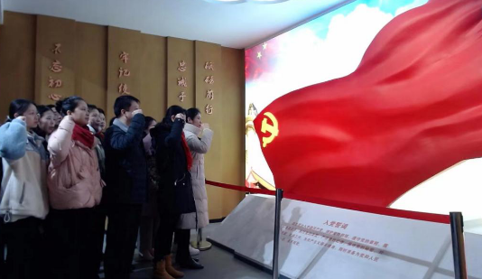 作为志愿服务第一支队伍,党团员们怀着敬仰的心情参观了吴孟超院士馆,面对党旗,举起右手,重温入党誓词。