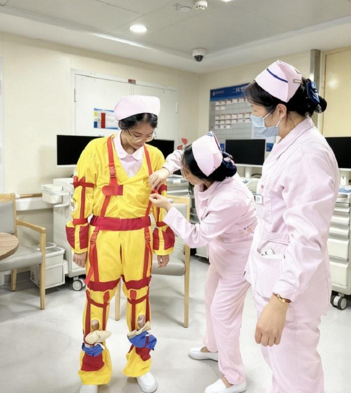 活动现场,护士们换上了特制的体验装备——包括负重背心、关节约束带、视觉模糊眼镜、听力衰减耳塞等。这套“老人体验服”精准模拟了老年人常见的视物模糊、听力下降、关节僵硬、弯腰驼背等生理状态。在护士长的指导和专科护士的陪伴下,体验者们开始了难忘的“蹒跚之旅”。