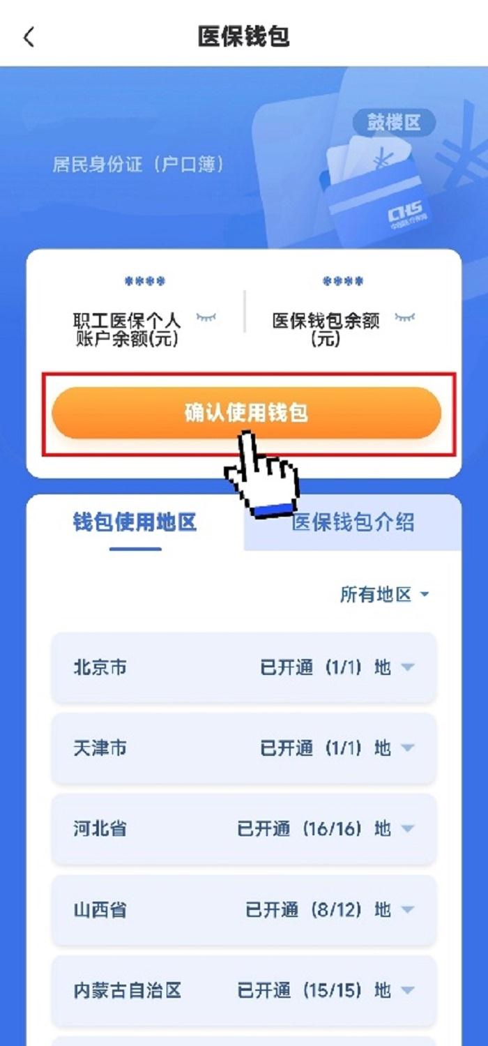 1、打开“国家医保服务平台”APP,在首页点击进入「医保钱包」专区,查询您和亲属所在的城市是否开通医保钱包功能,确认后,点击「确认使用钱包」。