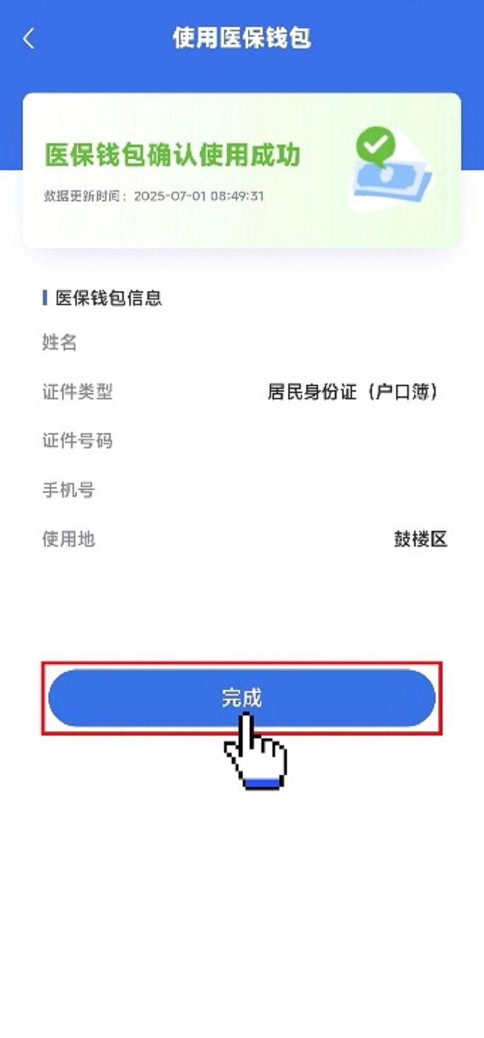 2、选择使用地,填写绑定手机号,点击「立即确认使用」,在“医保钱包确认使用成功”界面,点击「完成」。