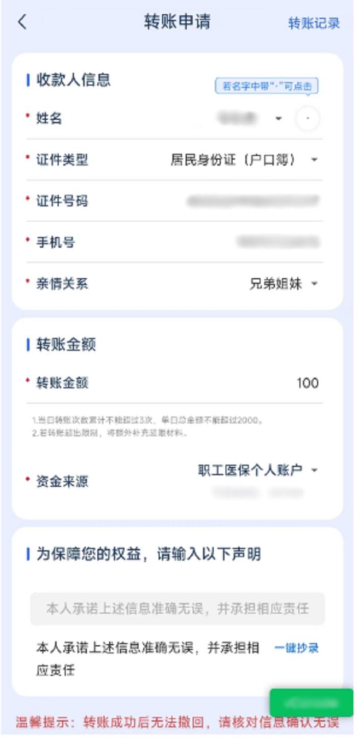 1、激活后在「医保钱包」专区,点击「医保钱包转账申请」,按要求填写收款人信息、转账金额等,确认无误提交。