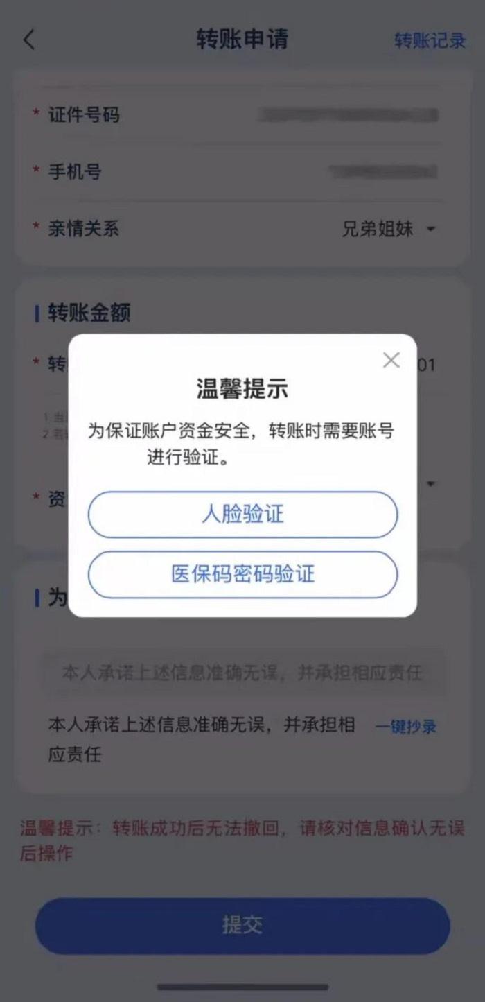 2、提交后,选择“人脸验证”或“医保码密码验证”。验证通过后,转账成功。(可通过「医保钱包」专区可查询转账记录)