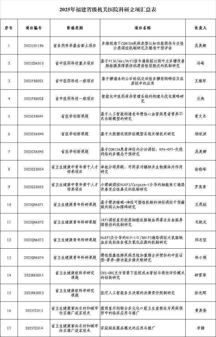 立足新起点,展望新征程。我院将以此次突破为契机,进一步强化科研战略布局,严守科研诚信生命线,完善项目全过程精细化管理,确保高水平科研成果的持续产出与高效转化。我们将始终胸怀“国之大者”,聚焦人民健康重大需求和临床诊疗关键难题,深耕基础研究,以开放合作的姿态引领学科交叉,致力于产出更多具有前瞻性、标志性和临床应用价值的原创成果,持续赋能医院高质量发展,为构建更高水平的健康福建、护佑八闽大地人民群众的生命健康与福祉,贡献机关医院力量。