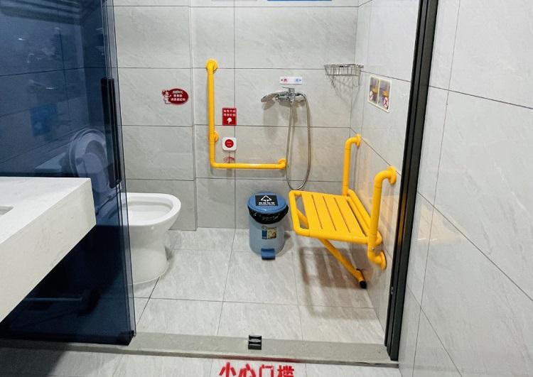 卫生间设置了坐式淋浴装置,马桶一侧的墙上还安装了扶手,以及紧急呼叫铃,高度确保老人坐在马桶上、淋浴时,伸手就能按到。