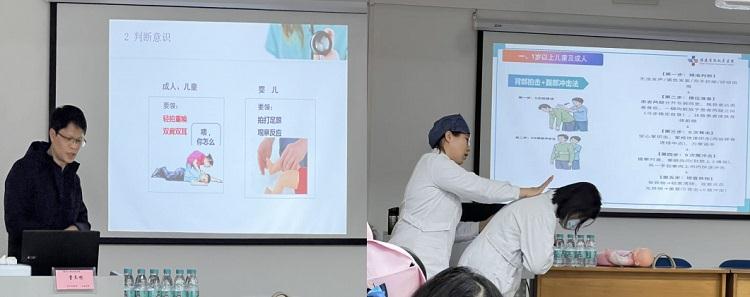 实操演练环节中,参训人员热情高涨,纷纷分组使用模拟教具尝试规范操作。医护团队全程巡回指导,针对按压角度偏差等细节问题及时纠正,确保每一位参与者都能熟练掌握两项急救技能的核心流程。