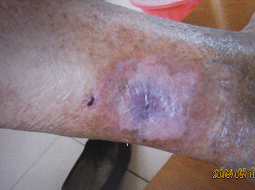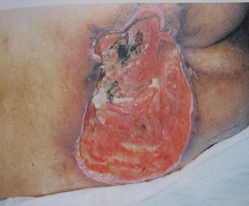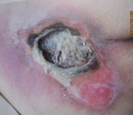 图2-5皮肤变紫,深部组织受损 图2-6黑痂覆盖伤口,布克分级或分期